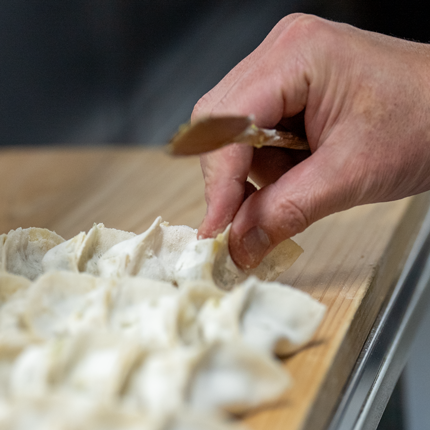 三島産白菜の甘みと旨みを活かしたシンプルな餡。噛むほどに深い旨味が広がるよう仕上げています。自家製の皮はフワッとした手触りが特徴。高温の鉄鍋で焼き上げることで、外はカリッと香ばしく、中はもちもちの食感に。一つひとつ丁寧に包み、焼き上げることで、最高のバランスを生み出しています。