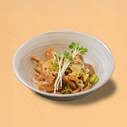 国産の肩ロースを使用し、秘伝のタレに2日間漬け込んだ自家製焼き豚。じっくりと火入れすることで、旨味が凝縮され、しっとりとした食感に仕上げています。メンマも市販のものとは違い、じっくりと味を染み込ませた自家製。コクのあるタレで煮込み、しっかりとした食感と豊かな風味を引き出しています。
